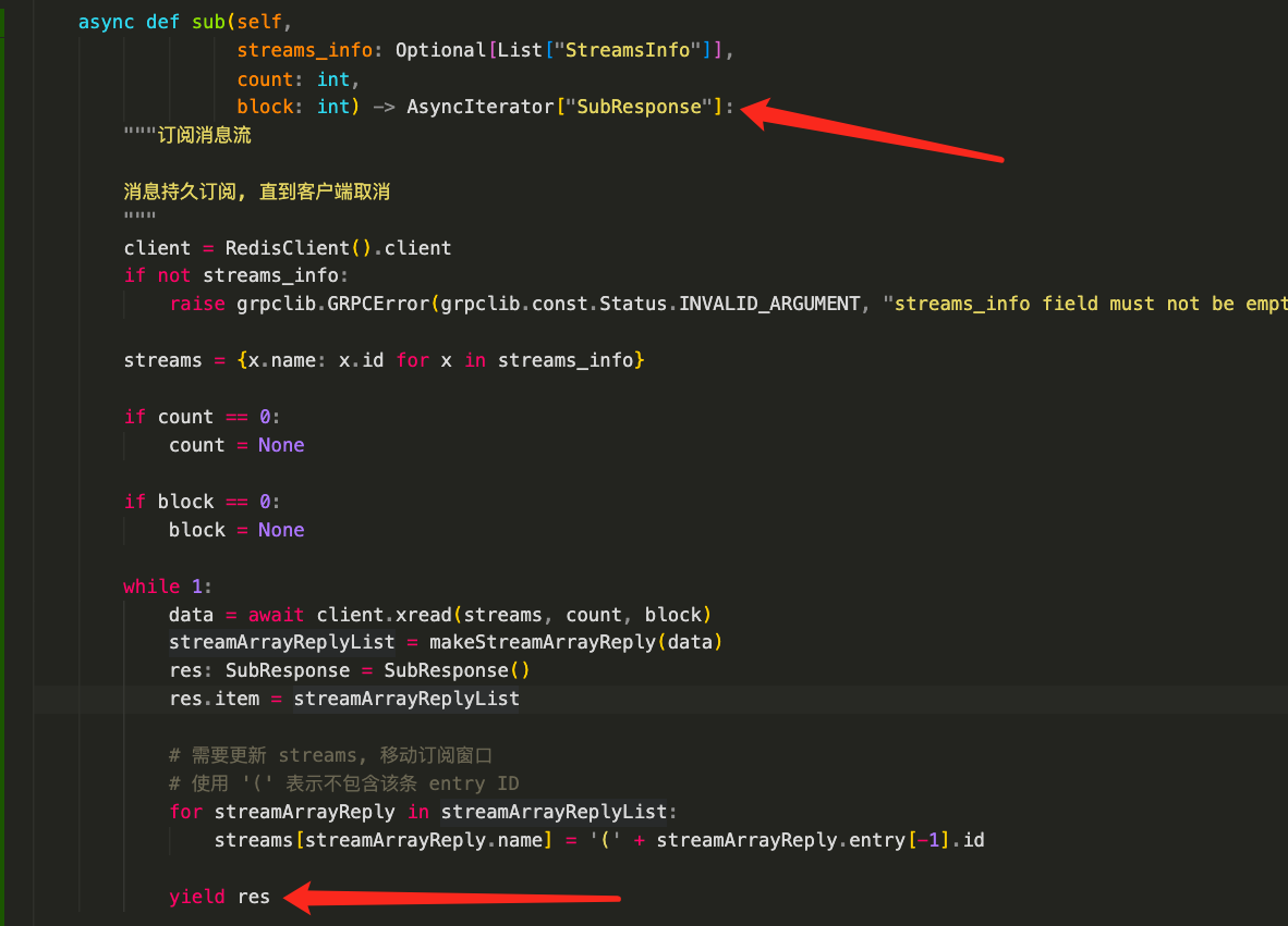 error: Return type "AsyncIterator[SubResponse]" of "sub" incompatible with return type "Coroutine[Any, Any, AsyncIterator[SubResponse]]" in supertype "RedisStreamServiceBase"